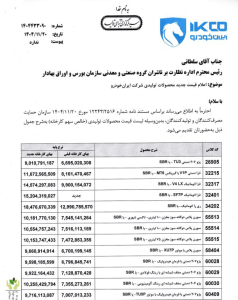 عادل پیرمحمدی در نامه ای به رییس اداره نظارت بر ناشران گروه صنعتی و معدنی سازمان بورس و اوراق بهادار با موضوع قیمت جدید محصولاتش تولیدی ، قیمت های جدید این شرکت را اعلام کرد.