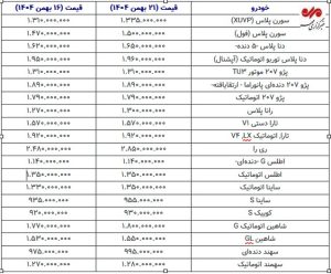 در بخش خودروهای اقتصادی، رانا پلاس با رشد ۳۰ میلیون تومانی، به یک میلیارد و ۳۰۰ میلیون تومان رسید؛ در حالی که تارا دستی و اتوماتیک در قیمتهای ۱.۵۷۰ و ۱.۹۲۰ میلیارد تومان بدون تغییر باقی ماندند.