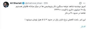 شریعتی با اشاره به تحولات اخیر بازار ارز اظهار کرد: بعد از التهاب ارزی شدیدی که در هفتههای گذشته شاهد آن بودیم و متأسفانه بخشی از آن ناشی از جرقهها، بهانهها و دستاویزهای عوامل بدخواه در جریان حوادث تلخ اخیر بود، با تغییر رئیسکل بانک مرکزی و اصلاح برخی سیاستها، از جمله حذف ارز های ترجیحی، شرایط بازار ارز وارد فاز جدیدی شد.